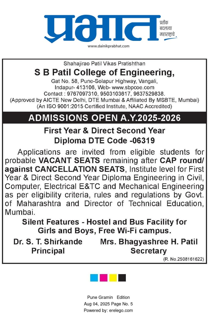 S.B. Patil College of Engineering, located in Indapur, Maharashtra, was established in 2009 and is part of the Shahajirao Patil Vikas Pratishthan. The college offers a variety of undergraduate engineering programs and boasts a 44-acre campus equipped with modern facilities, including well-stocked libraries, laboratories, and sports amenities, while also achieving notable placement records with recruiters like Amazon and TCS
